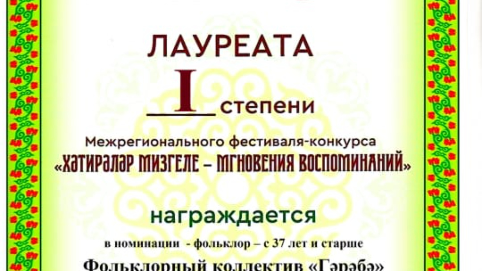 Фольклорный коллектив Туктарского сельского клуба "Гэрэбэ" и солистка ансамбля Гимадиева Гатифа стали Лауреатами I степени и благодарность за активное участие в Межрегиональном фестивале-конкурсе "Хэтирэлэр мизгеле - мгновения воспоминаний"организованный центром Государственного автономного учреждения культуры Республики Марий Эл,