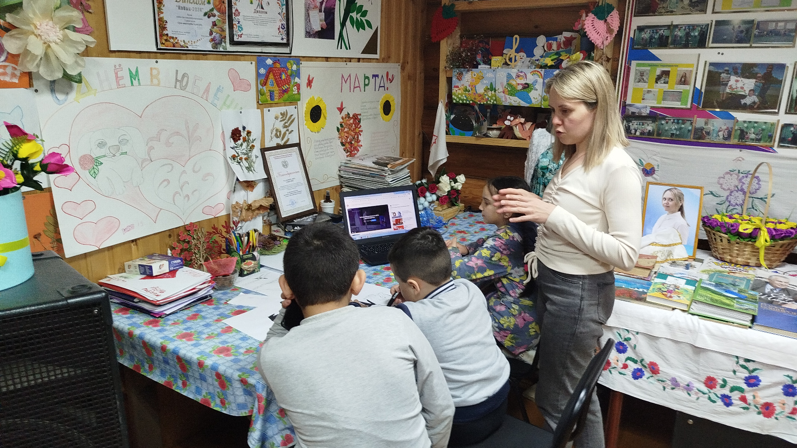 Ведущая на протяжении всей программы рассказывала ребятам о создании детской организации, о главных символах: пионерском галстуке, значке, горне и барабане. О том, чем занимались пионеры. О жизни пионерской организации. Рассказала о дружбе и взаимопомощи, о своем пионерском детстве, о том как принято было жить и учиться по законам Пионерии.