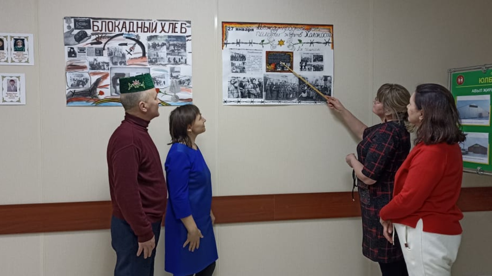 Чарада катнашучылар стена газетасы материалларын караудан яһүд халкының фаҗигасенең килеп чыгышы һәм аның масштабларын ачучы документлар турында белделәр.